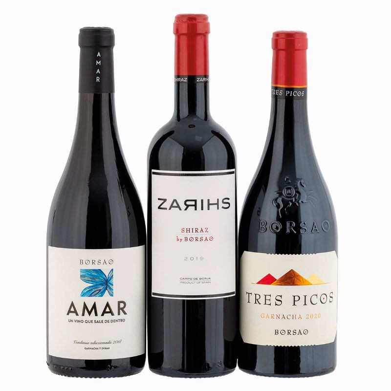 CAPRICHO DE BORSAO REF.666 1 - Botella 75 cl. Vino Borja Tinto V.S. "Amar" by BORSAO 1 - Botella 75 cl. Vino D.O. Campo de Borja Syrah "Zarihs" BORSAO 1 - Botella 75 cl. Vino D.O. Campo de Borja Tinto Garnacha "Tres Picos" de BORSAO 1 - Caja de Madera |